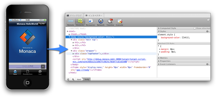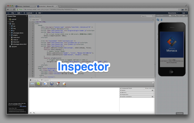 Monaca new feature release. Inspector added, PhoneGap2.0 compatibility introduced, Monaca debugger improvements, Windows WebDAV support added