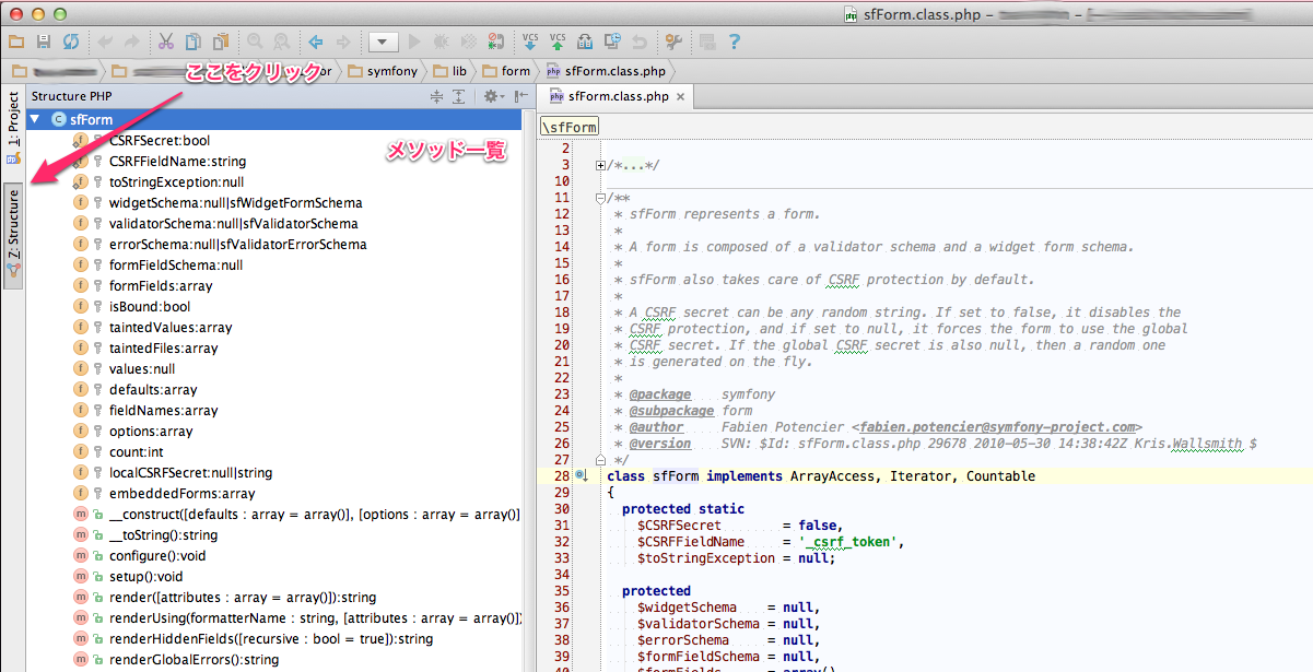 クラスで定義されている関数一覧を見ることができます。EclipseにはあったのにPHPStormではどこにあるんだろう、と結構長い間探していましたがこんなところにありました。