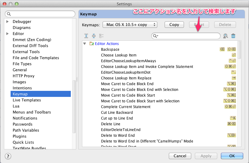 設定する際は一覧から目的のアクションを探して、キーボードショートカットを設定します。アクション名は画面上部の検索ボックスから検索することもできます。