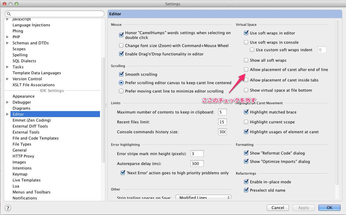 一度、.ideaファイル(PHPStormの設定ファイル)を誤って削除してしまった時に、行末よりも奥にカーソルが移動するようになってしまい、すごくもどかしい思いをしたことがあります。