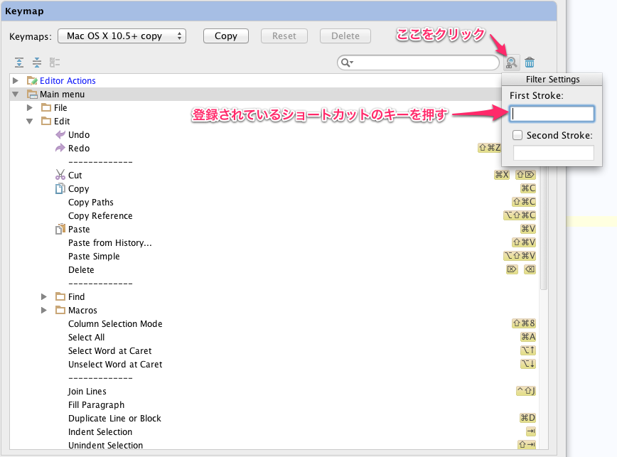 通常Keymapの検索はアクションの名前で行いますが、実は実際に登録されているショートカットのキーから検索する機能を見つけました。