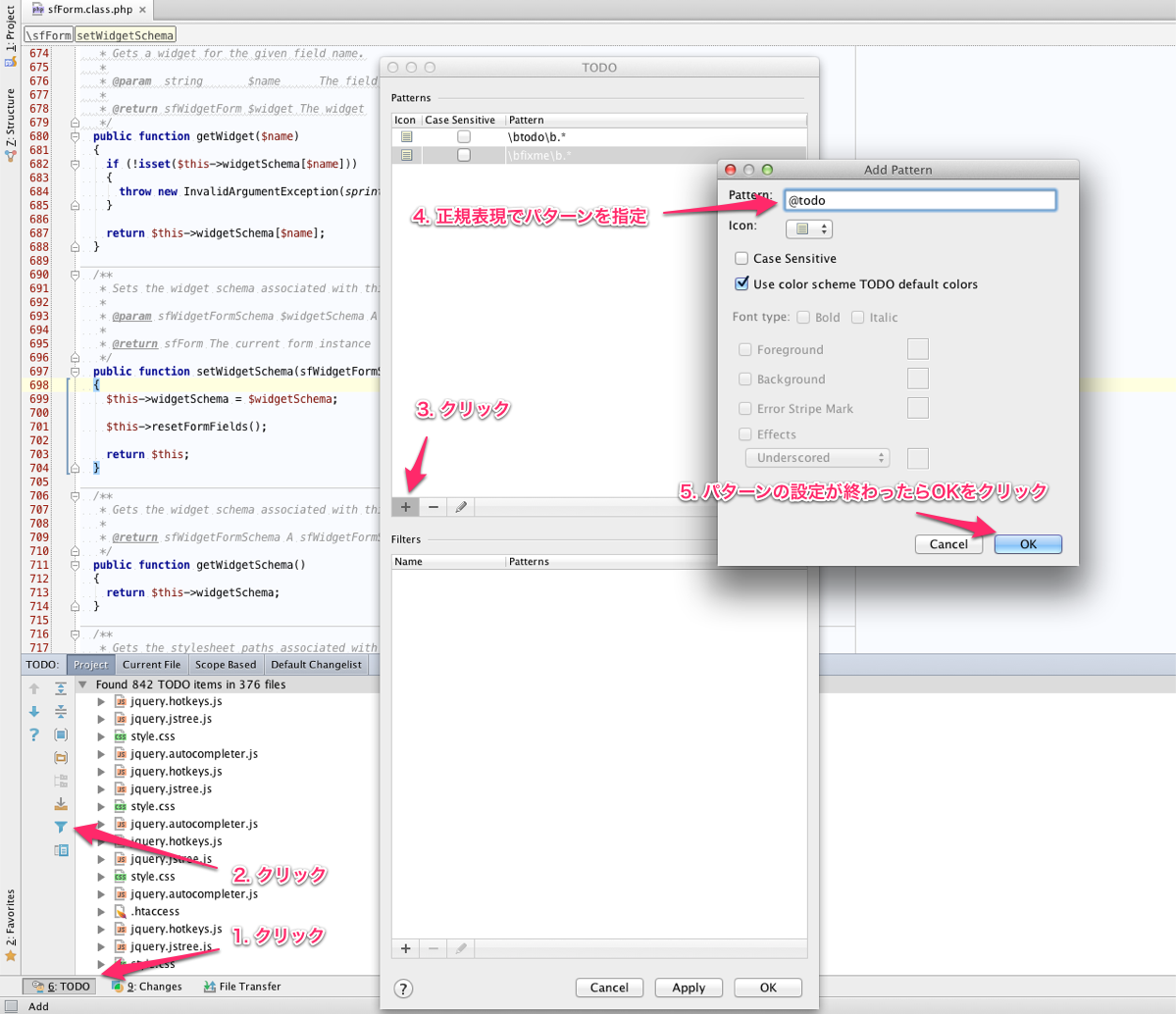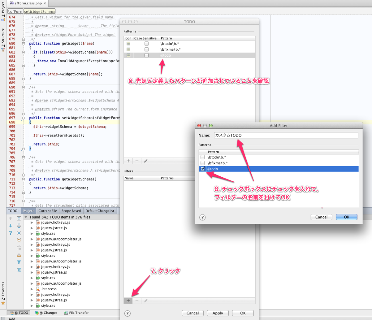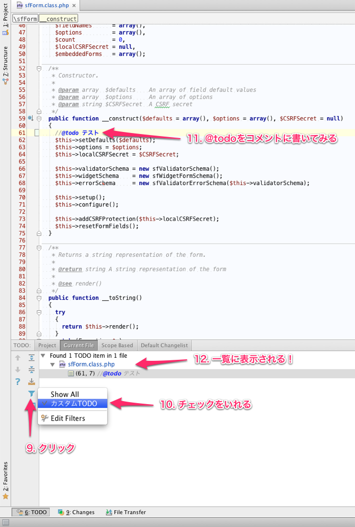 デフォルトの設定だと、「todo」と書くとPHPStormが自動で色をつけてくれます。しかしフレームワークや既存のコードにtodoが残っていると、どれが自分の残したtodoかわからなくなってしまいます。そんな時には、PHPStormのTODO機能を使って自分用のtodoを作りましょう。