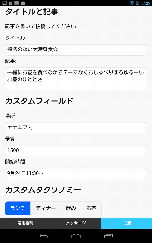 こちらが投稿アプリです。起動すれば即、投稿フォームが表示されるため、WordPressの管理画面にログインするよりもスムーズに投稿を行うことができます。カスタム投稿タイプごとにフォームを複数用意でき、カスタムフィールドも切り放題です。