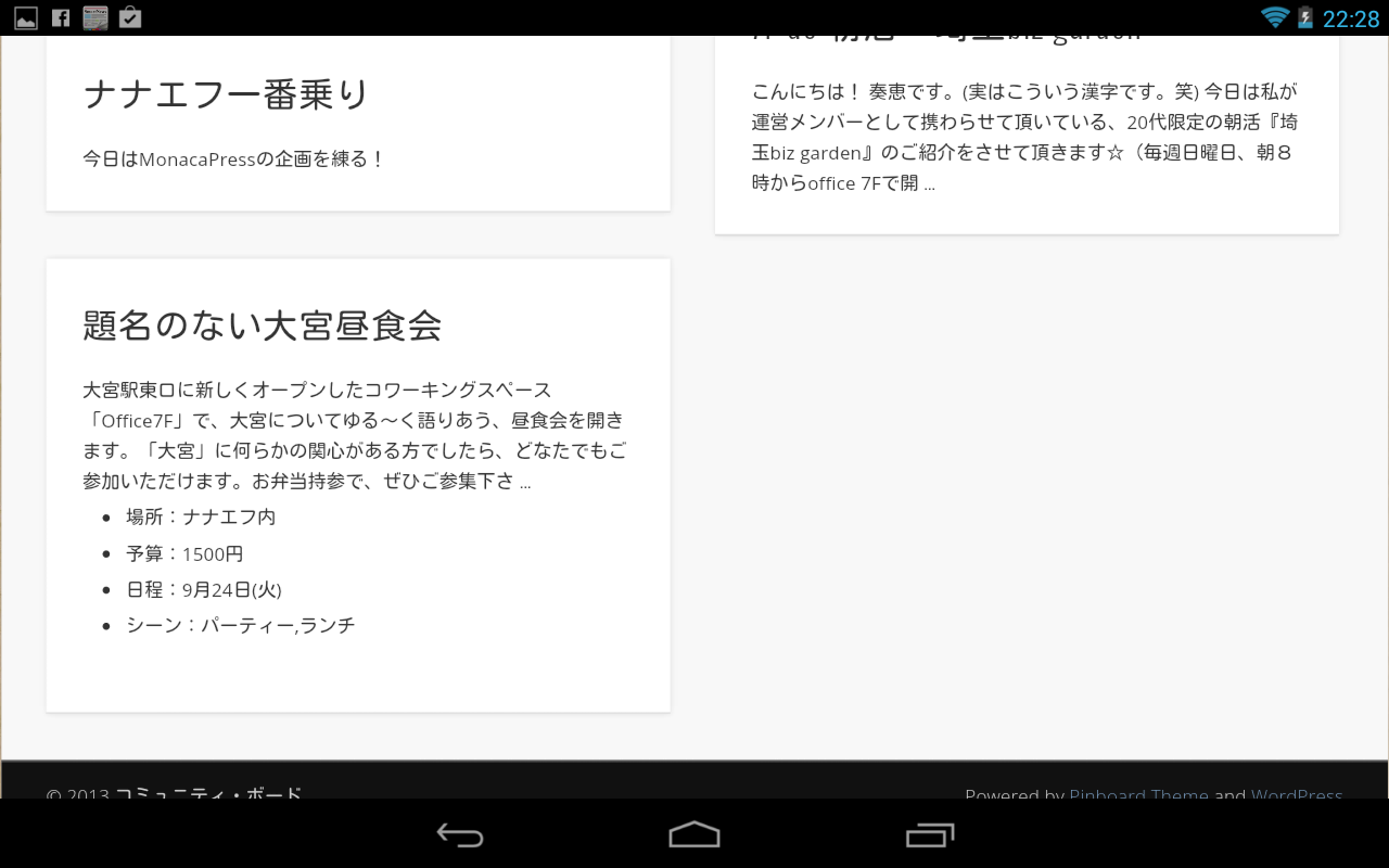 上記のようなタイル型の表示ができるWordPressテーマを選択したうえで、jQueryのanimateを利用して画面を自動スクロールさせます。また、カスタムフィールドやカスタム投稿タイプを、ランチやディナーのお誘いに活用してみました。