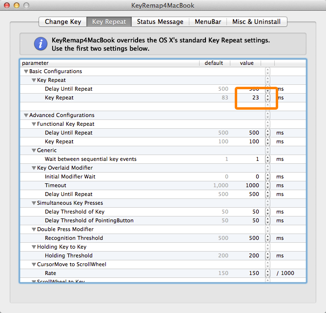 こちらのvalue値を小さくすることでキーリピート速度が早くなります。