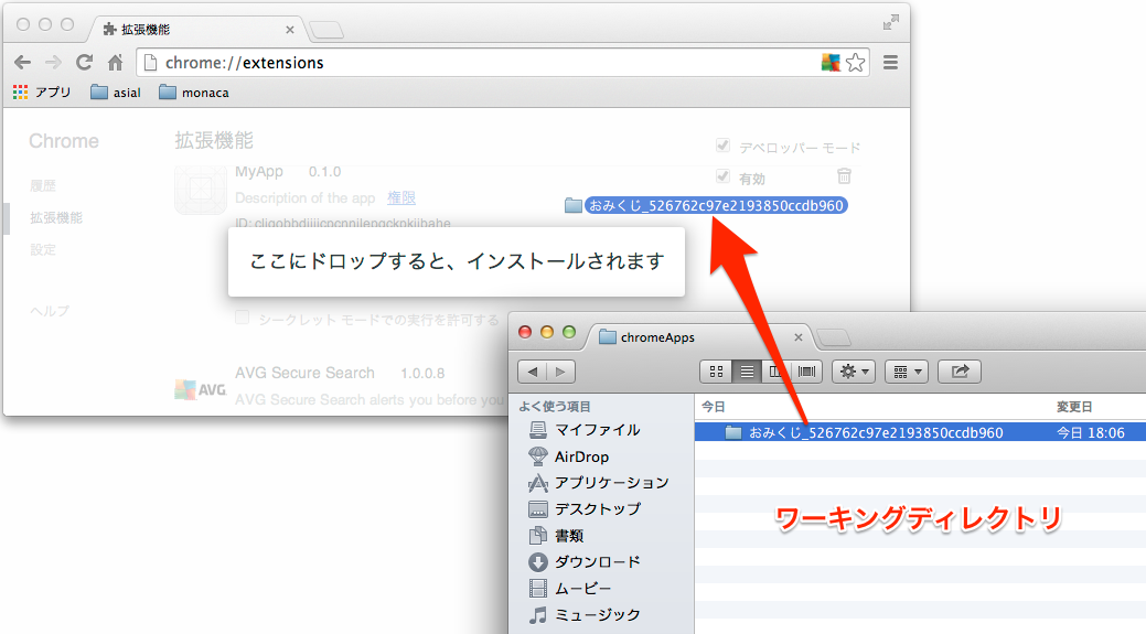 そして対象のプロジェクトフォルダを、Chromeの「拡張機能」画面にドラッグ&ドロップします。