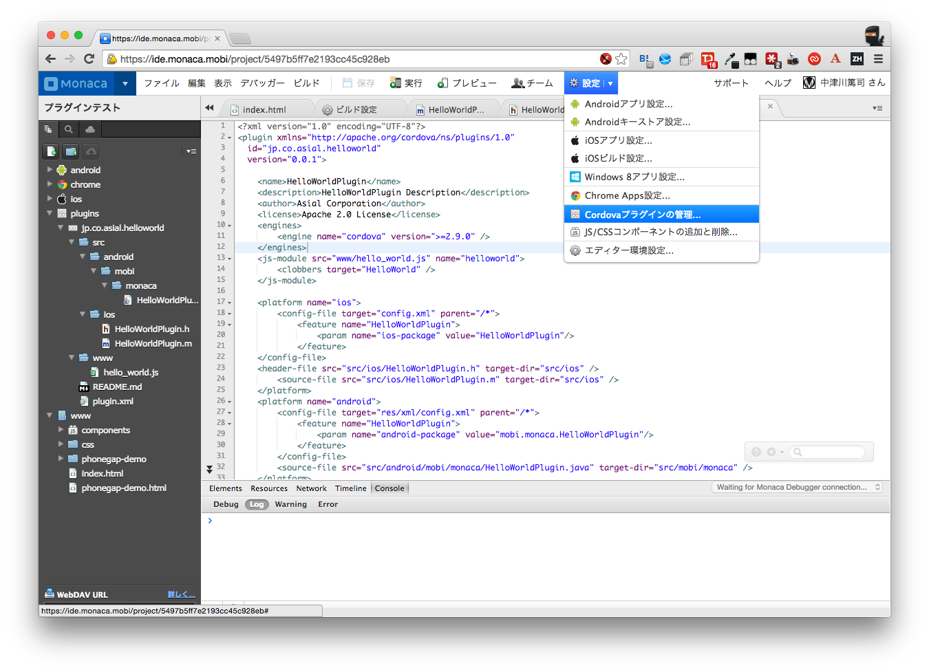 Monacaで新規プロジェクトを作成したら、 設定>Cordovaプラグインの管理 を選択します。