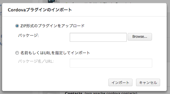 開いた画面で、Cordovaプラグインのインポートをクリックします。