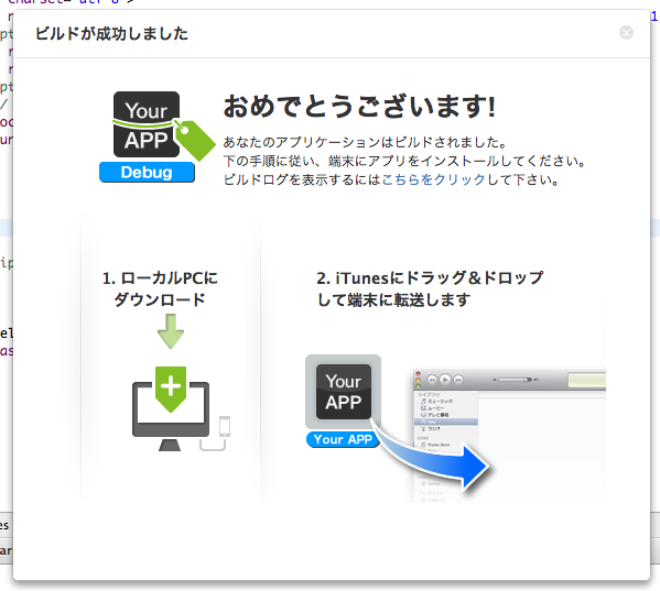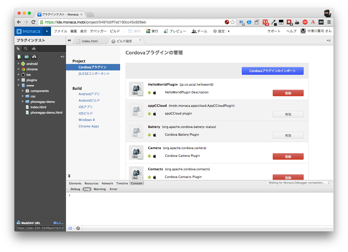 後はいつものようにアプリをビルドしてみましょう。なおMonacaデバッガーではプラグインに対応していませんので、iOS/Androidアプリとしてビルドする必要があります。