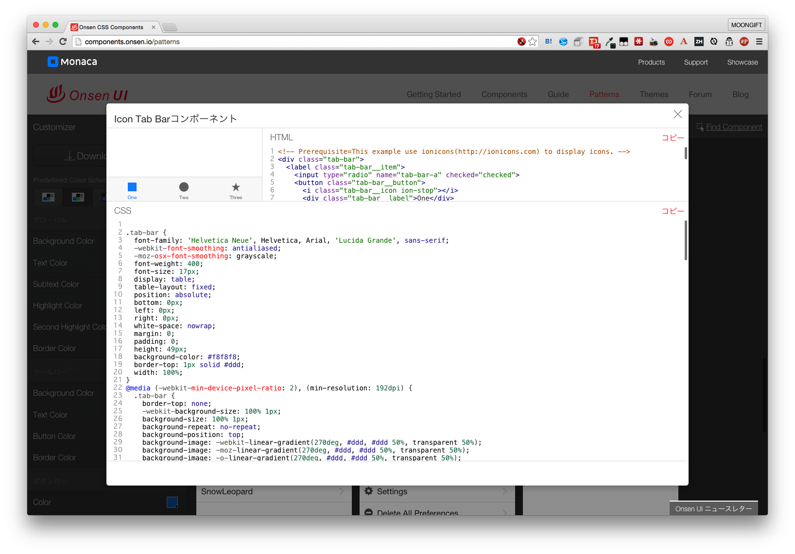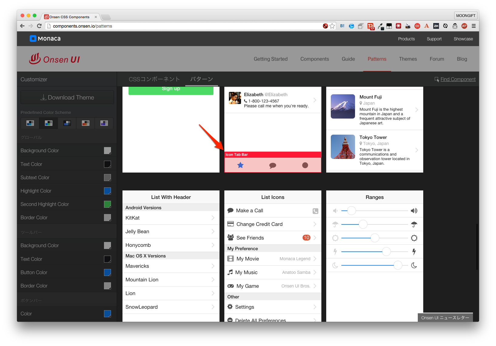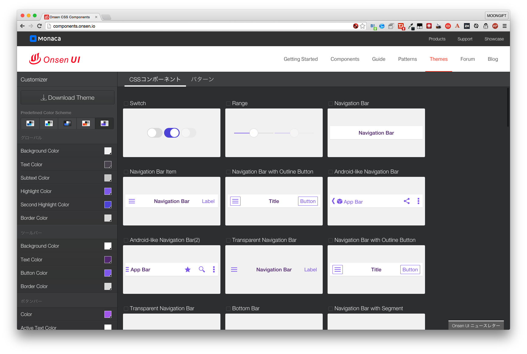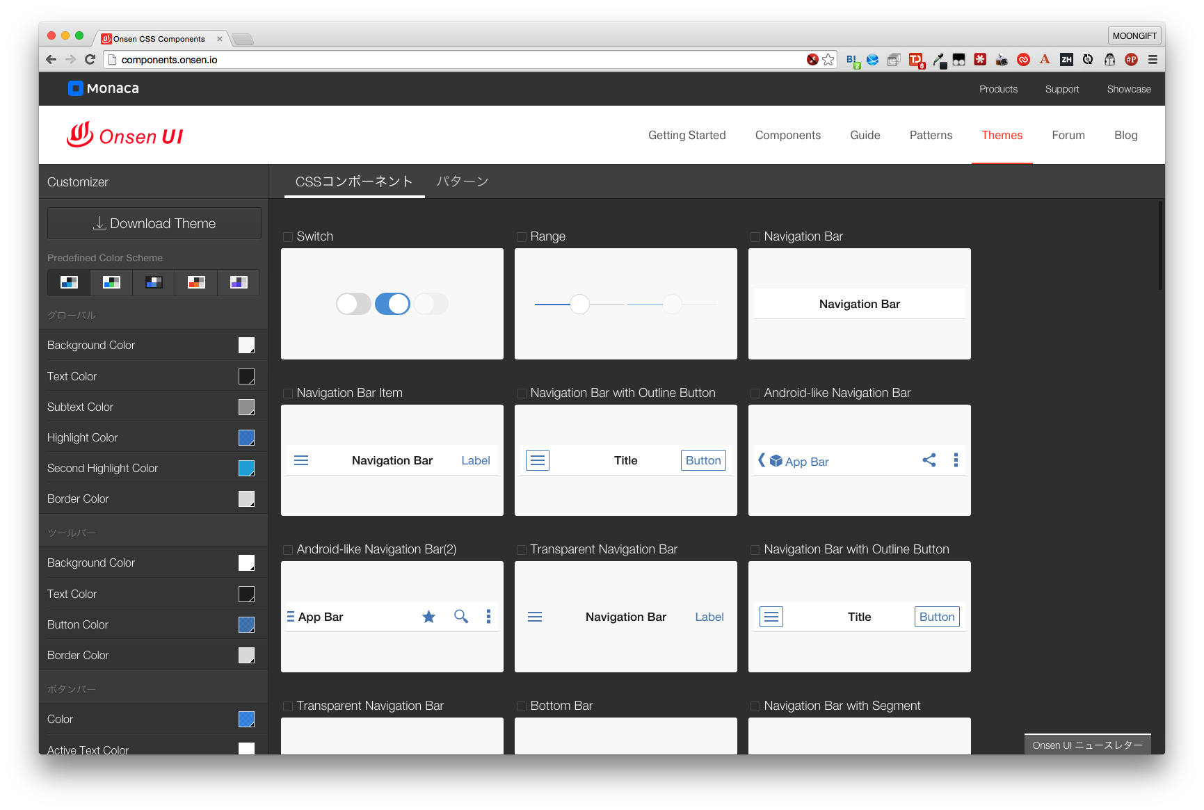 Onsen Theme Rollerはビジュアル的に確認しながら作業が進められます。様々なアプリUIのパターンを見ながら最適なテーマカラーを作成してください。