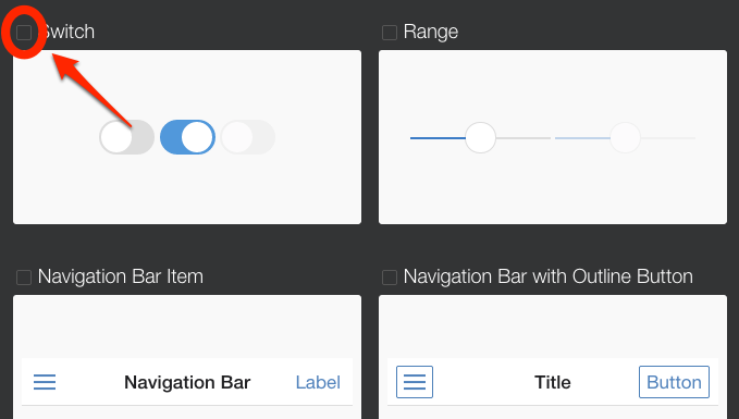 見て分かる通り、各UIコンポーネントが並んでいます。スイッチやレンジ、ナビゲーションバーといったUIコンポーネントに加えて、リストに入ったスイッチ、各種リスト、ポップオーバー、アラートなど60種類以上のコンポーネントが登録されています。