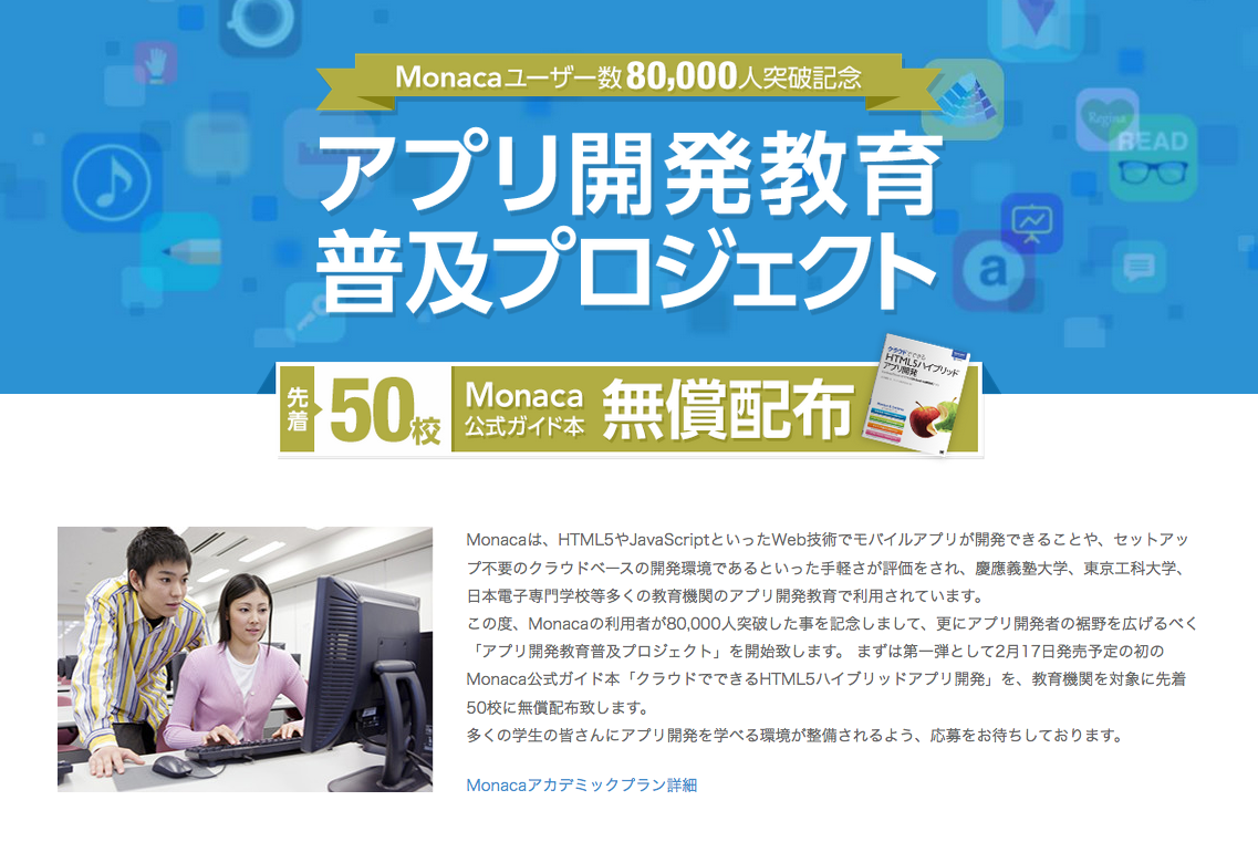 まずは第一弾として2月17日発売の初のMonaca公式ガイド本『クラウドでできるHTML5ハイブリッドアプリ開発』を、教育機関を対象に先着50校に無償配布致します。