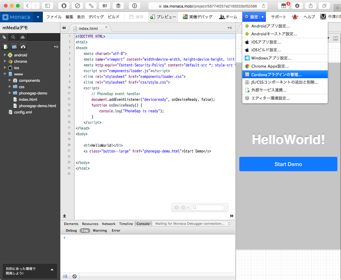 プラグインをインストールするので、floatinghotpot/cordova-plugin-mmediaのサイトからZipファイルとしてダウンロードします。そして、そのZipファイルをMonaca IDEの設定メニュー>Cordovaプラグインの管理からアップロードします。