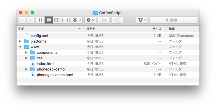 SourceMapファイルの初期化やCoffeeScriptからJavaScriptへの変換を行った後、www/js/app.jsというファイルで書き出しています。