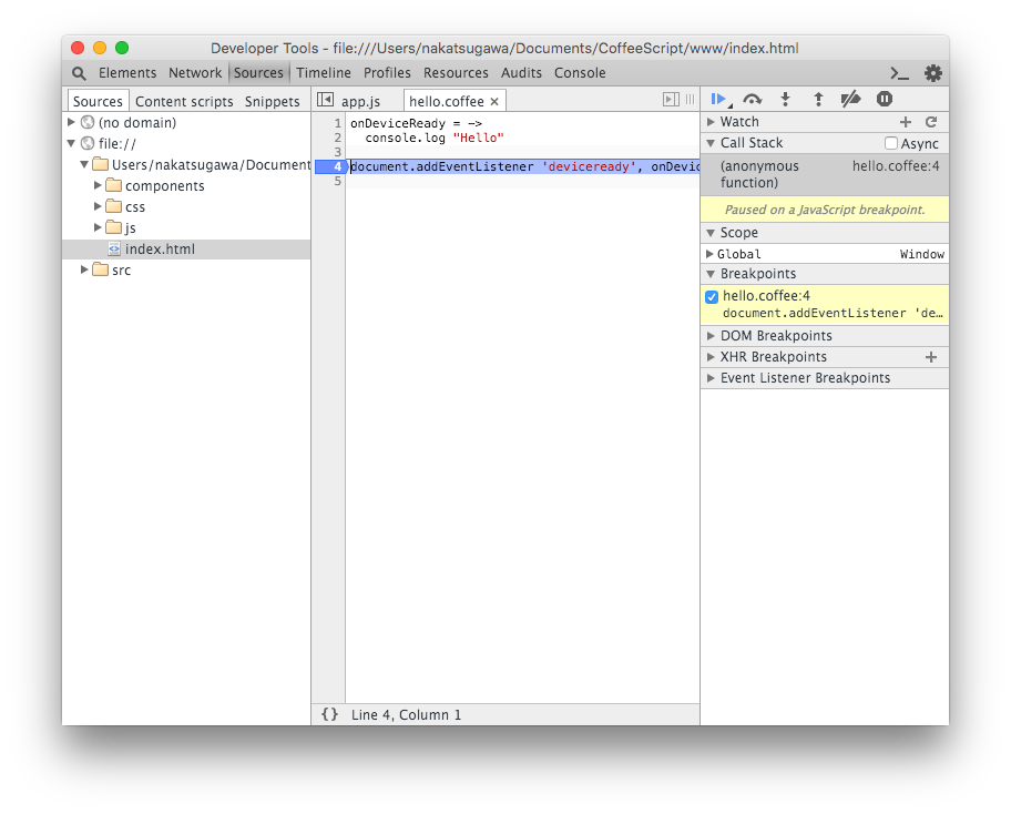 Sourcesタブでsrc/hello.coffeeを開いて、ブレークポイントをチェックするとちゃんと止まるのが確認できるはずです。