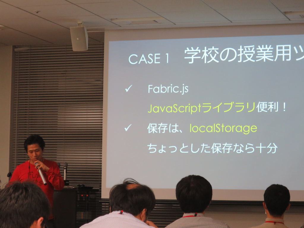 まず事例の紹介がありました。学校の授業用ツールのカンガルー(iPad向けApp Store)になります。ある問題に対して、特徴挙げていきつつグルーピングします。マインドマップ的な、授業中に使う思考ツールです。アプリはCordovaで作られていて、データはlocalStorageに保存するようになっています。
