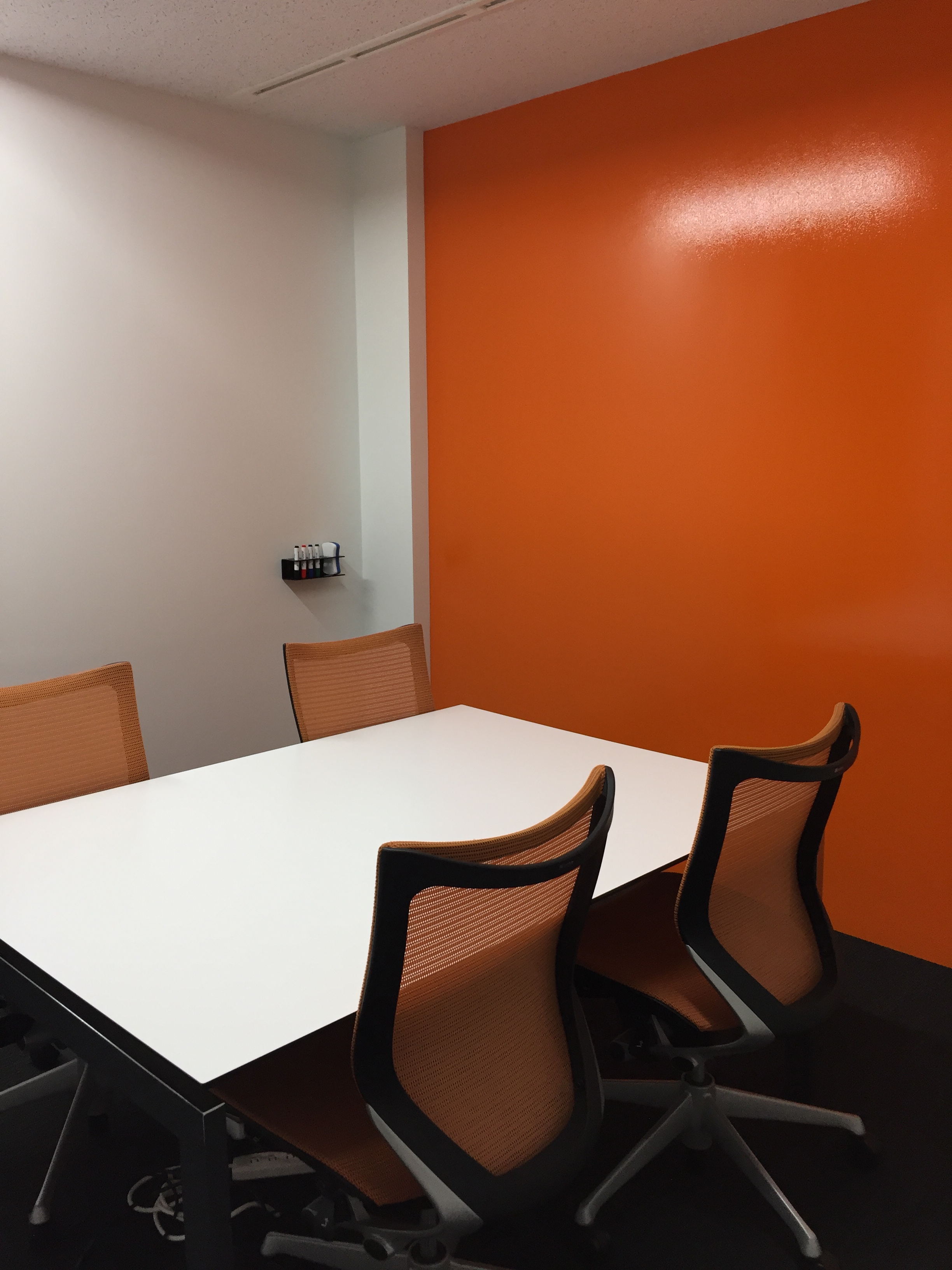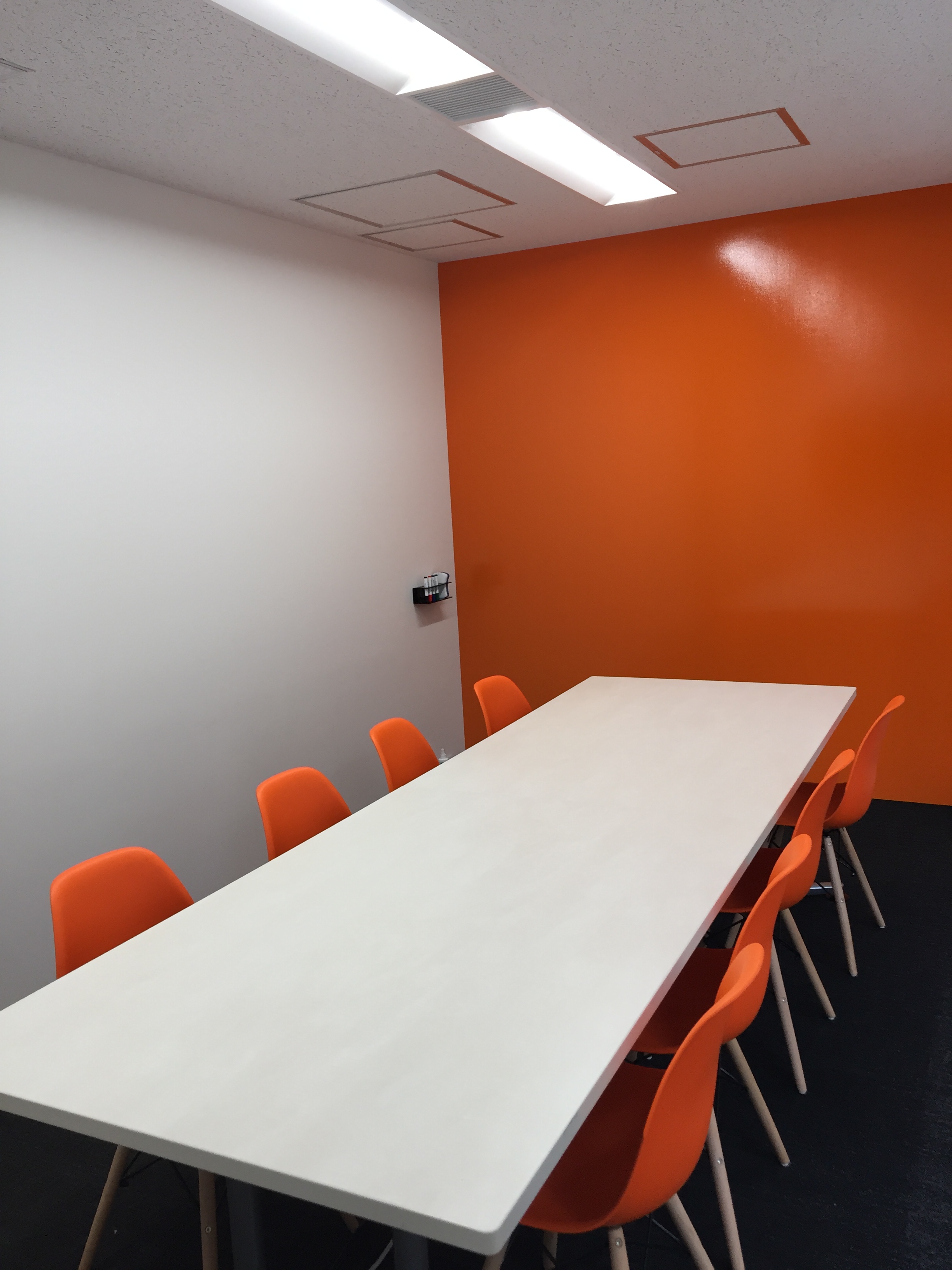 ミーティングスペースはテーマカラーであるオレンジとホワイトを基調に。