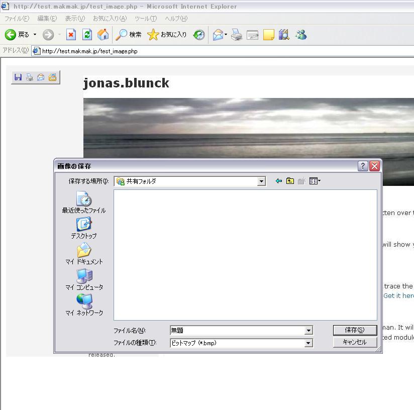 その時、IEでアクセスして、表示されたjpeg画像を保存しようとすると、何故かbmpと判断されるという問題が。。。次のは再現画像です。