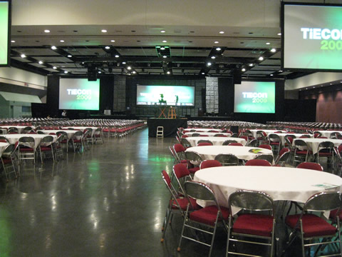 ○ TiECON メイン会場。何千人という聴講者が入れるように整然と椅子が並べられています。