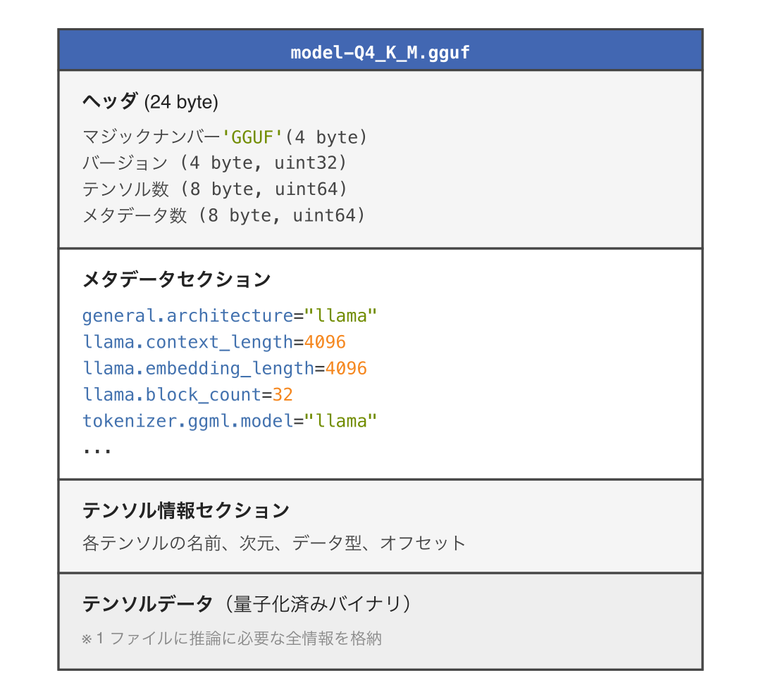 | 保存内容 | 重み(量子化済み)+豊富なメタデータ(アーキテクチャ、トークナイザ設定など) |
