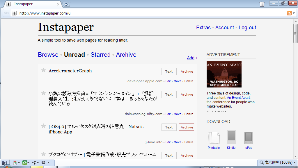 instapaperは非常にシンプルで使いやすいサービスなのでオンラインブックマークを使っていない方も試してみることをお勧めします。