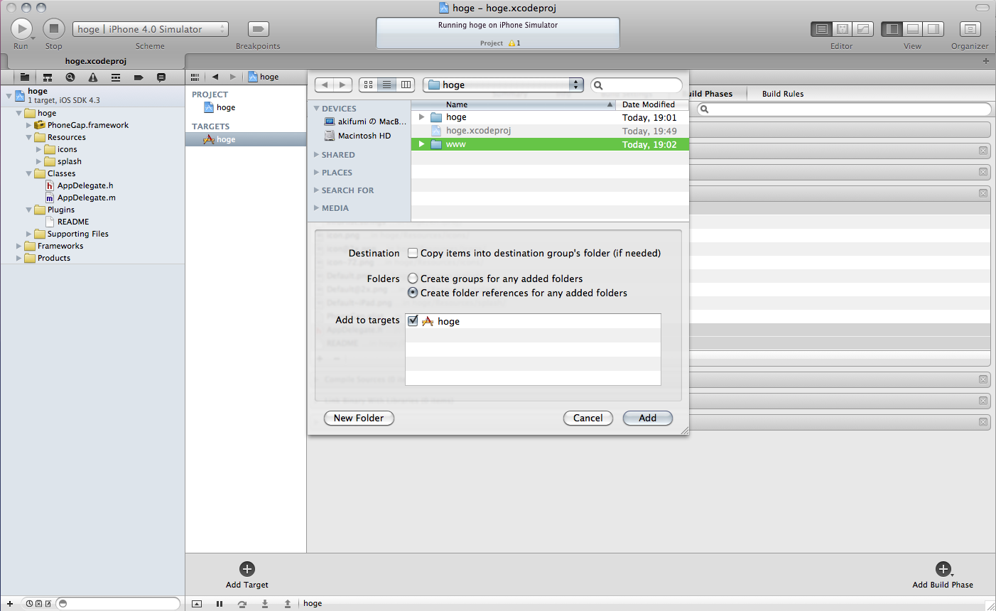 Xcodeの「File > Add Files to プロジェクト名」でファイルを追加します。プロジェクトの直下にwwwというフォルダがあるので、そのフォルダを選択し、Destinationという項目の「Copy items into destination group's folder(if needed)」のチェックを外し、Foldersという項目の「Create folder references for any added folders」を選択して、Addボタンを押します。