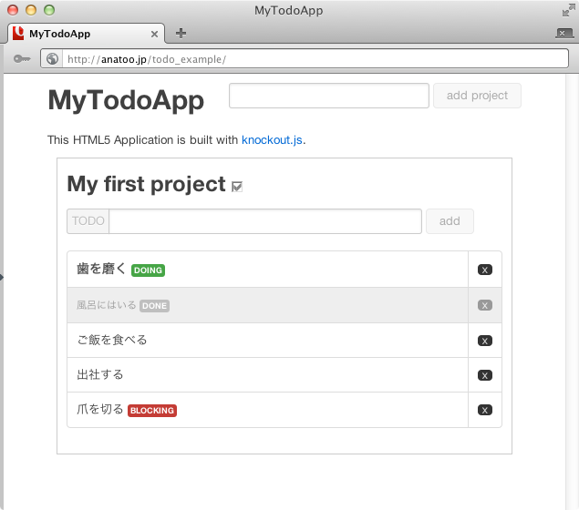 とりあえず、これを用いてTODO管理アプリのデモを作ってみました。デザインを整えるためにTwitter Bootstrapを利用しています。宣言的な記述のおかげで、インタラクションのためにコードを長々と書く必要が一切なく、コードが非常にすっきりしています。HTMLやCSSなど含めて160行程度に収められました。