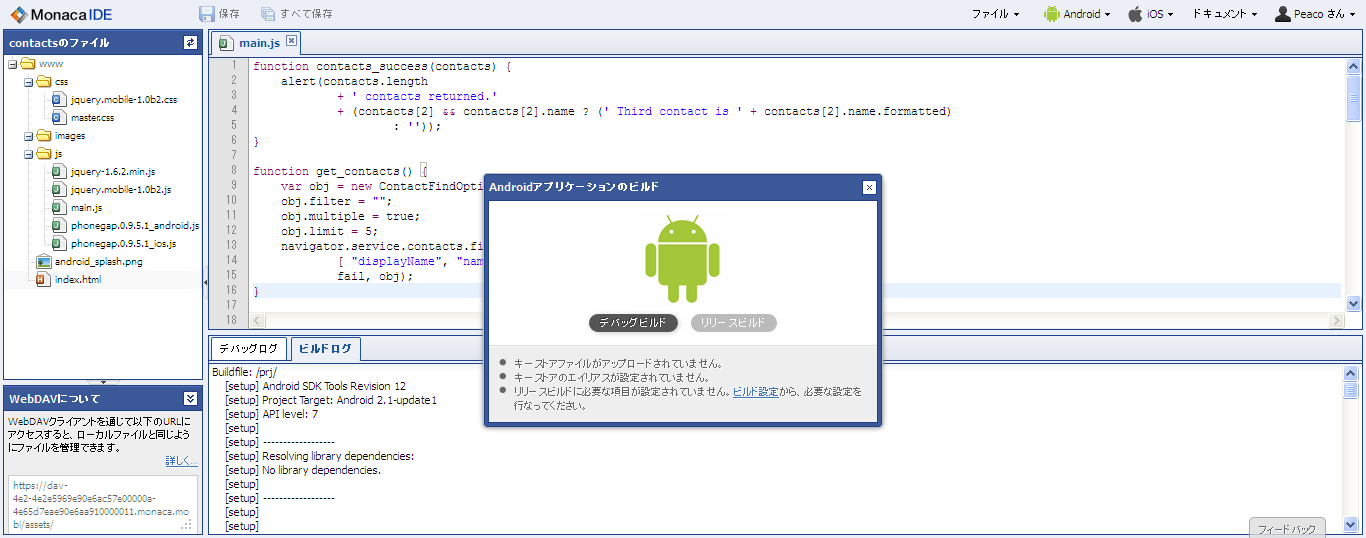 下図のような画面が出ますので、「デバッグビルド」をクリックします。