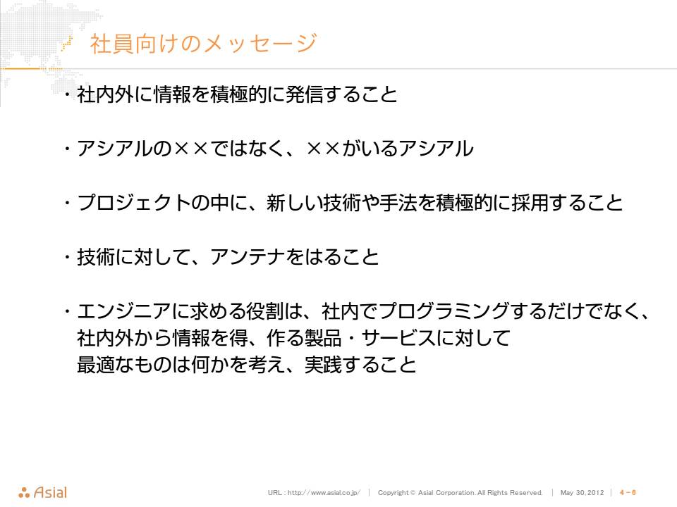 アシアルでも、数年前にメンバーから募集して、「アシアルとは?」をテーマにメッセージを作成し、最終的に「最新トレンドをいち早くシステム化し、お客様のビジネスに感動を与える、少数精鋭のものづくり集団」という言葉を定めました。