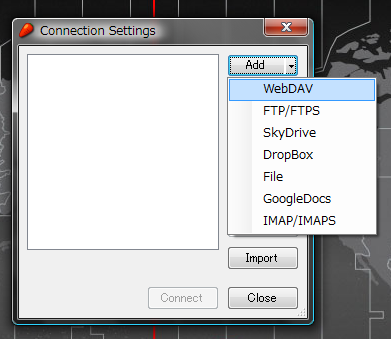 ダウンロードしたファイルをダブルクリックし、インストーラの指示に従ってインストールを進めてください。インストール完了後,起動すると次のような画面が表示されます。Add ボタンをクリックし,WebDAV を選択します。