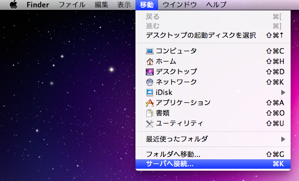 次にデスクトップのメニューから「移動」,「サーバへ接続」を選択します。