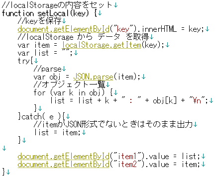 localStorage にはテキストしか保管できませんので、通常、JSON 化を行い、保存します。そのため、パース&整形をしてデータを表示するようにします。JSON形式でないデータの場合は、そのまま表示するようにします。また、itemが配列になっている場合などは、うまく表現できませんので、データをそのまま表示するテキストエリアも用意します。